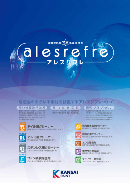 関西ペイントのアレスリフレシリーズは、タイル・金属・石材・塗装面など、建物で頻出する素材の汚れ課題に対して、用途別に専用設計された環境配慮型の修復洗浄剤です。