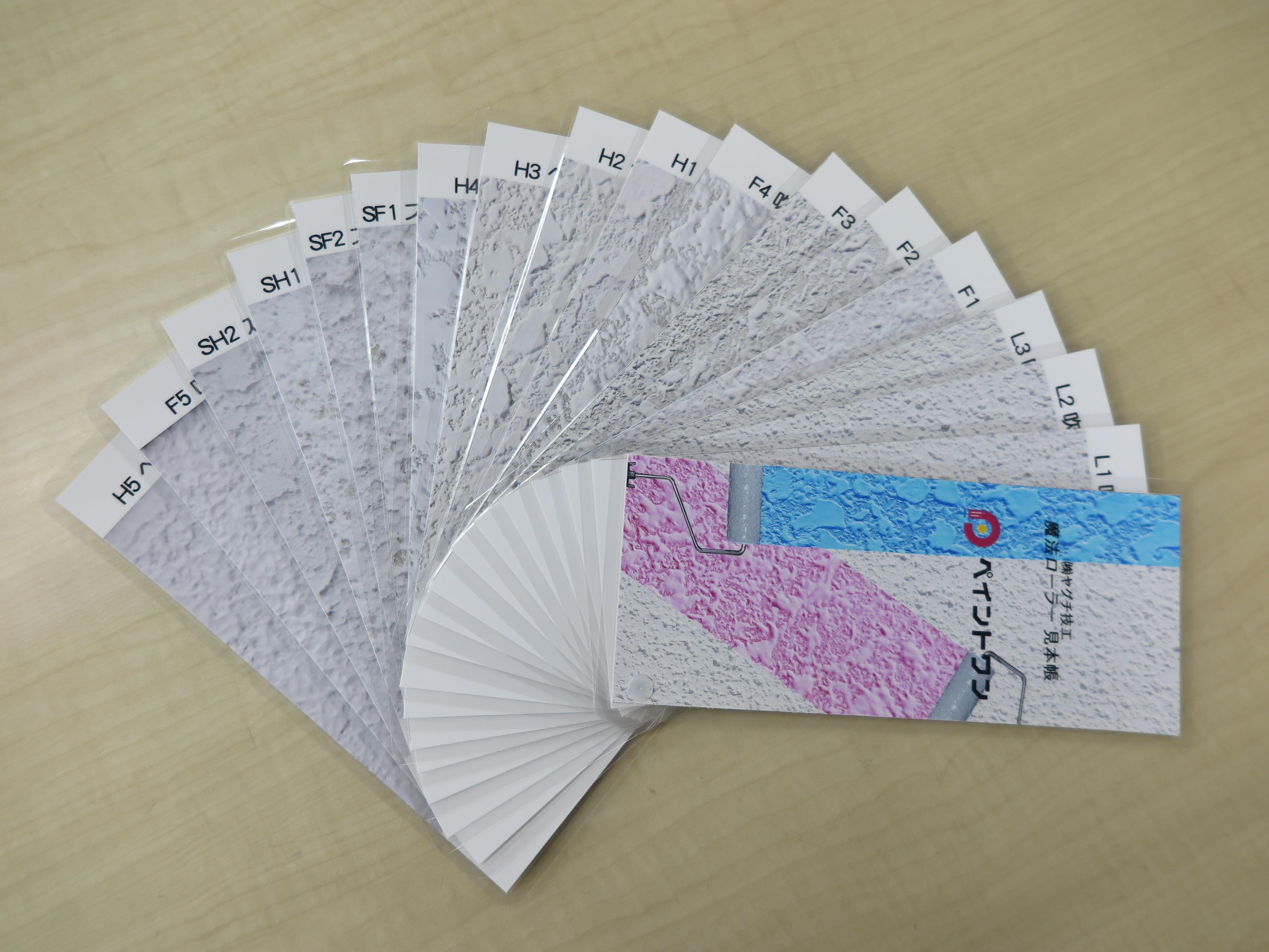 | 注意事項 | この見本帳は株式会社ヤグチ技工の了承のもと、魔法ローラーのパターン画像をラミネートし、見本帳として作成したものです。 実際の塗板見本を加工したものではありませんので、吹付材の凹凸の状態等の 質感の確認はできません。 |